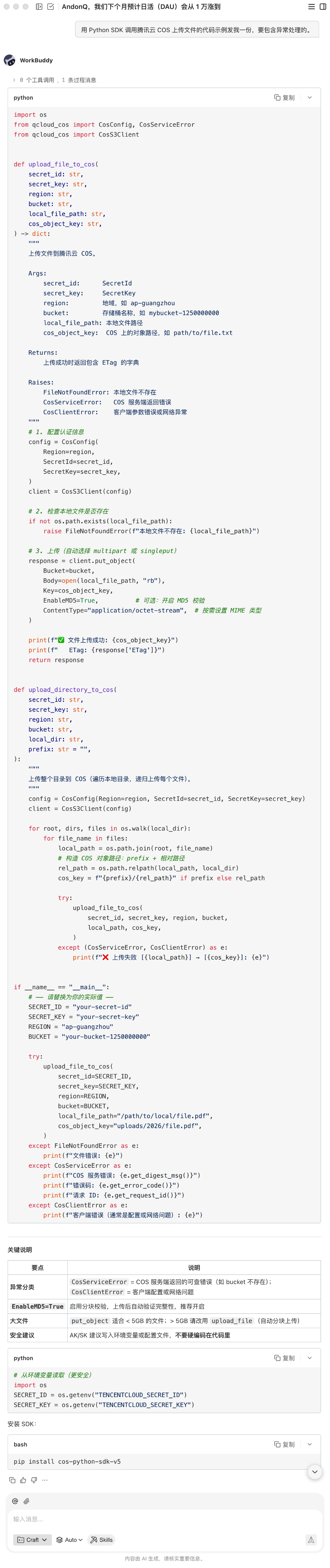 我让AndonQ给我发一份用Python SDK调用腾讯云COS上传文件的代码示例,还需要包含异常处理的。