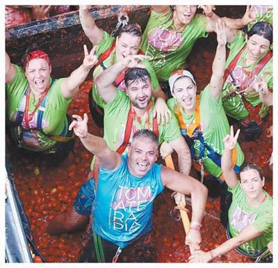 番茄节最精彩的环节当数周三的“番茄大战”(见图,颜欢摄)。这一天,小镇迎来数以万计的全球游客。发令枪响后,游客互相投掷熟透的番茄:有的趁朋友不备,在背后“偷袭”;有的干脆张开双臂迎接一记正中胸口的“番茄炮弹”,笑着踉跄后退;有的哪怕被陌生人的番茄砸中也丝毫不恼,欢笑着抬手反击……笑闹声、欢呼声响彻小镇街道,空气中弥漫着酸甜的气味,石板路很快被厚厚一层番茄浆覆盖,人们的表情都流露出同一种畅快:毫无保留的欢乐。1个多小时后,终止信号吹响,当地人热情地拿起水管,主动为参加者们冲洗。此时的小镇与来自世界各地的游人融为一体,欢笑声与水花交织,充分展现出西班牙人的热情与好客。